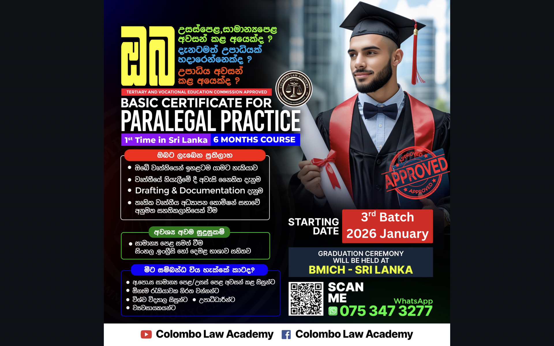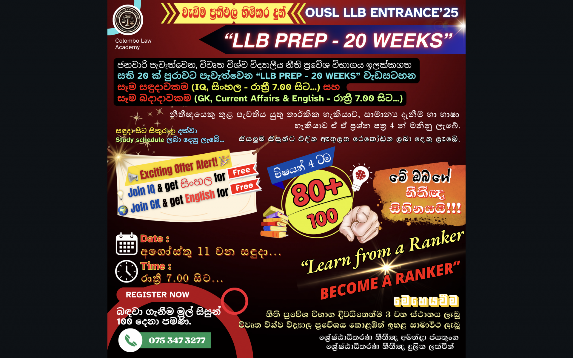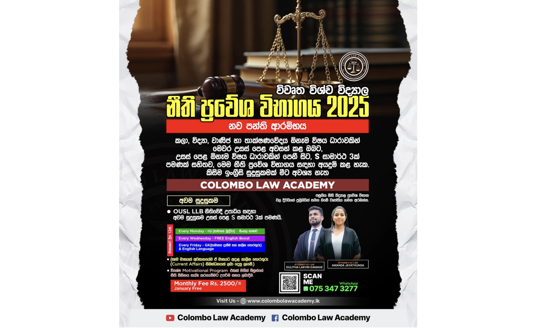 නීති ක්ෂේස්ත්රයේ මෙන්ම අනෙකුත් විෂය ක්ෂේස්ත්රයන් වලද, ඔබ දක්වන කැපවීම, උනන්දුව, උත්සහය ඔබව පහසුවෙන්ම එහි සාර්ථකත්වයේ හිනිපෙත්තටම රැගෙන යන බවට අපි තරයේ විශ්වාස කරමු. Colombo Law Academy අපි, සෑමවිටම සාම්ප්රදායික ඉගැන්වීමේ ක්රමවලින් ඔබ්බට යමු. අප සෑම විටම, නෛතික න්යායන්ගෙන් එහාට ගිය ප්රායෝගික යෙදුම් වලට ප්රමුඛත්වය ලබා දෙන්නෙමු. අද වන විට අපගේ සිසුන් නීති ක්ෂේස්ත්රයේ විවර කරගෙන ඇති බොහෝ මංමාවත් ගැන අපි බෙහෙවින් ආඩම්බර වන අතර, අදටත් ඒ බොහෝමයක් සිසුන්ගේ සිහින කරා යන ගමනට සහාය වීමට අපි ඇප කැපවී සිටින්නෙමු.